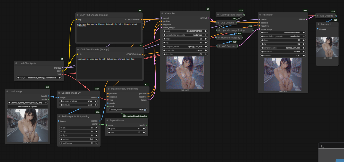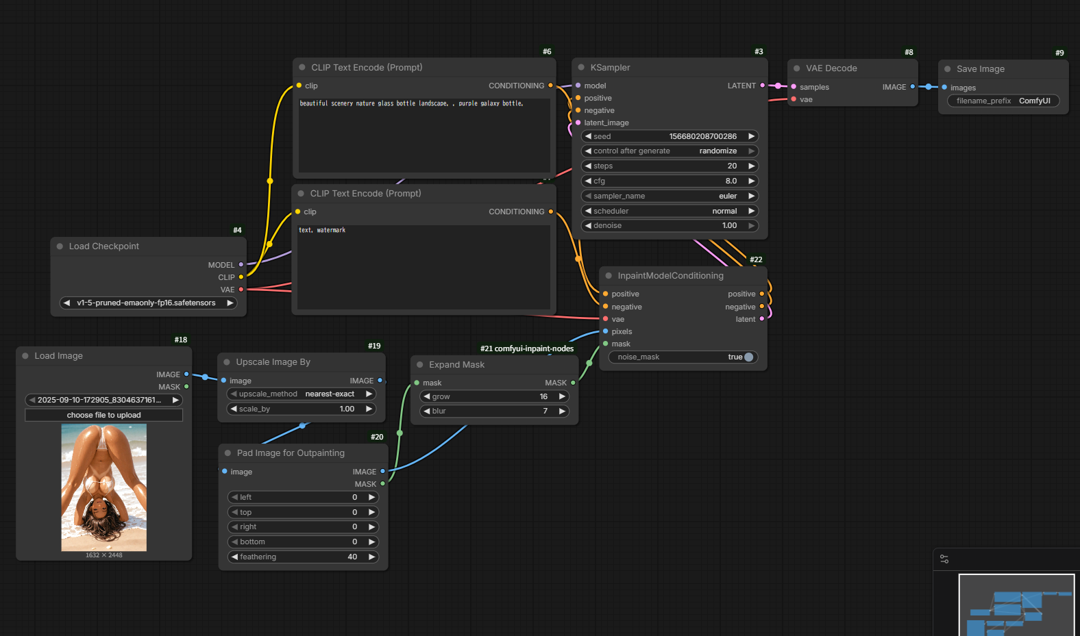 OutpaintでもInapintModelConditioning使うんですねって感じです。まぁ、確かにマスク個所書き足すのでやってることとしては変わりないのかもしれません。