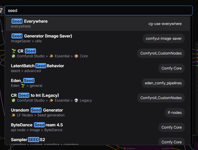 どういった用途で使用しているかというと各KSamplerでシード値を生成するのではなく、一か所で生成して同一のシード値を使うので同じことができるノードを探します。