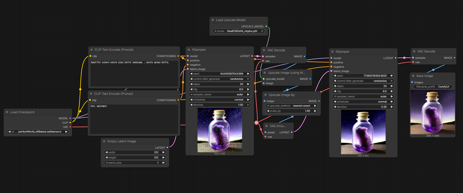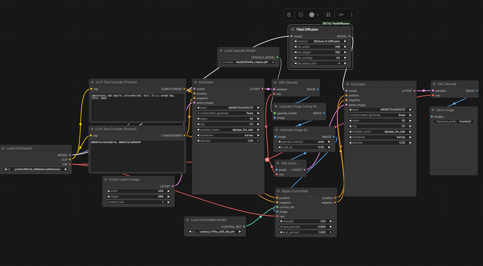 生成した画像をアップスケールする段階でTiled Diffusionを使用するため、まずはアップスケールのフローを構築します。