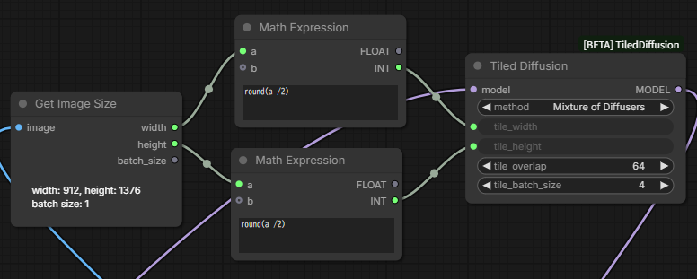 また画像のサイズから分割数を自動算出すると生成するサイズによらず分割できます。2026/3現在のComfyUIでは特にカスタムノードの必要もなく実現できます。