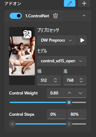 モデルには今回、SD1.5系を使うのでSD1.5系のモデルを選択します。サイズは出力する画像と同サイズです。その他の設定は調整しつつですが、一旦、Control Weightを0.80、Control Stepsを0-80%にします。