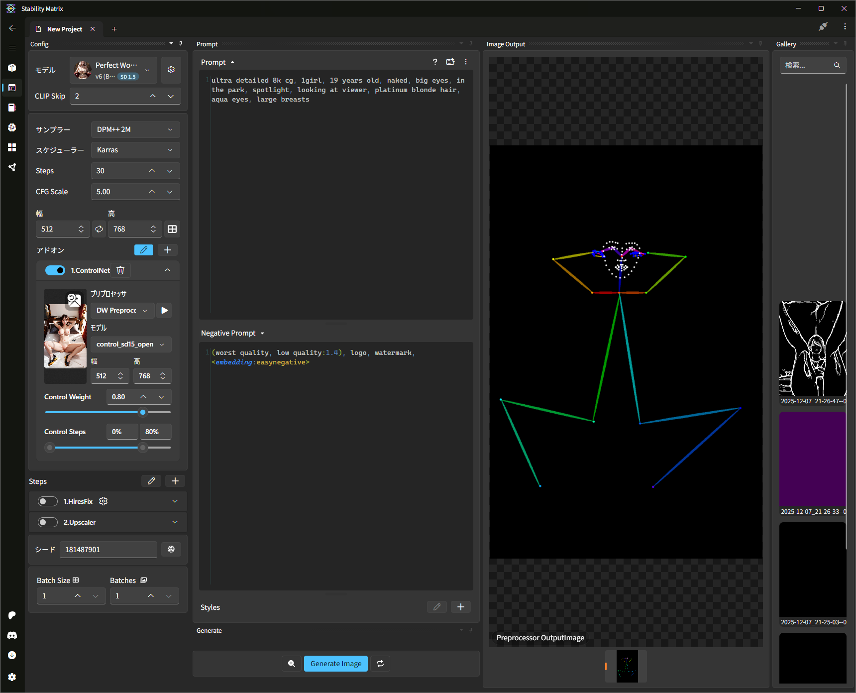 プリプロセッサの隣にある「▷」をクリックするとポーズの検出を確認できます。問題なければ画像生成を試してみましょう。