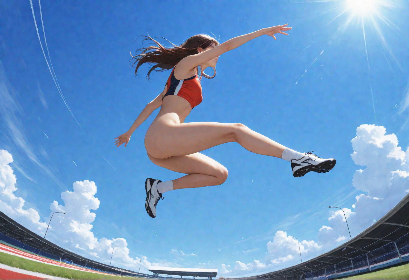 nsfw, masterpiece, best quality, ultra-detailed, 8k resolution, realistic, 1girl, 19 y.o, beautiful face, track uniform, bottomless, no panties, long jump, jumping, racetrack, from_below, from side