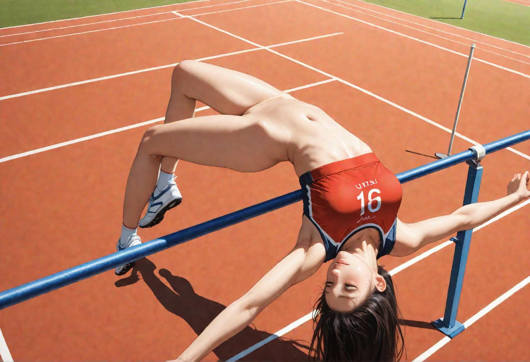 nsfw, masterpiece, best quality, ultra-detailed, 8k resolution, realistic, 1girl, 19 y.o, beautiful face, track uniform, bottomless, no panties, high jump, high jump bar, jump over bar, backward jump, track_and_field, from_above,