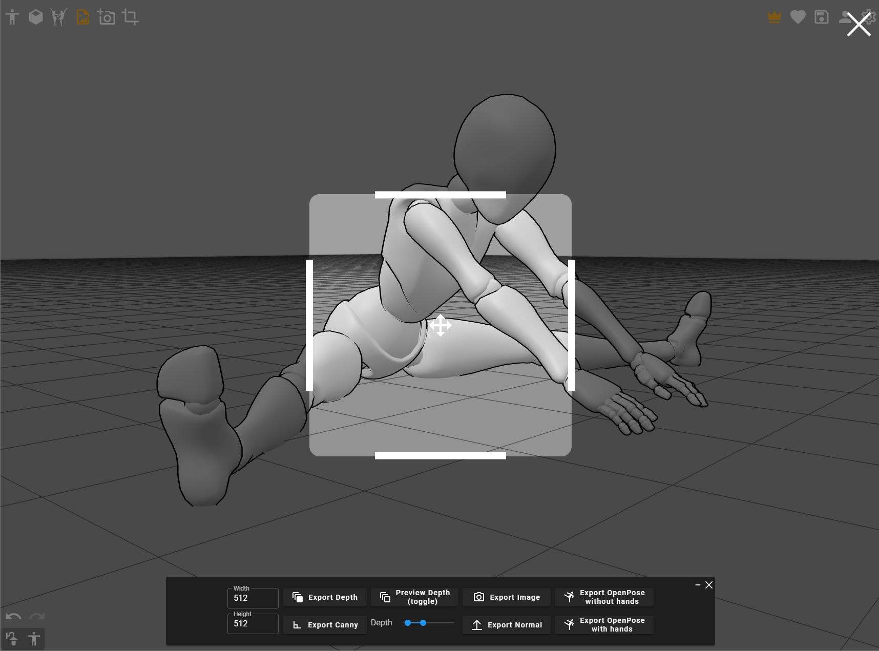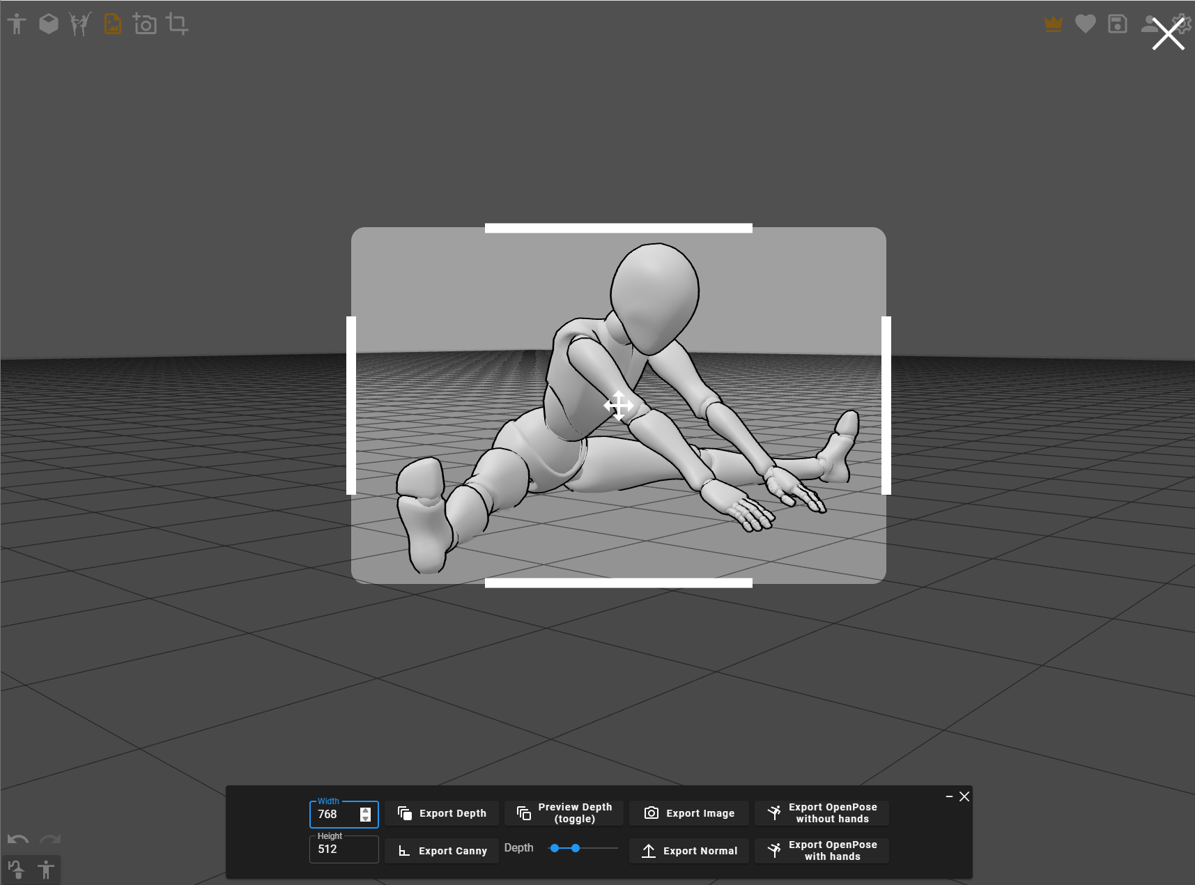 今回はSD1.5系のモデルを使用するので768 x 512に設定しまして、枠をドラッグでずらし収めました。「Export OpenPose without hands」と「Export Depth」をクリックしてデータをダウンロードします。