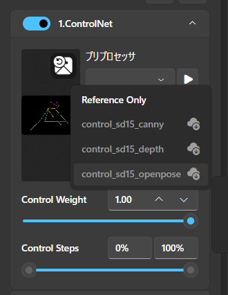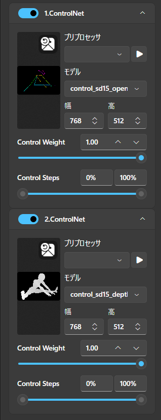 Inferenceを開き、アドオンから二つのCotrolNetを追加します。一つ目はOpenpose、二つ目はDepthです。