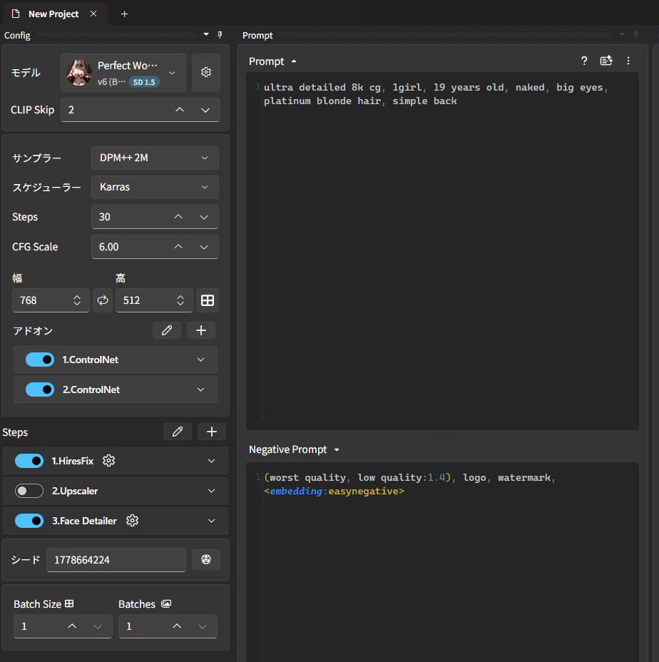 プロンプトを指定して生成します。ポーズはOpenposeとDepthで指定しているので余計なことは書きません。